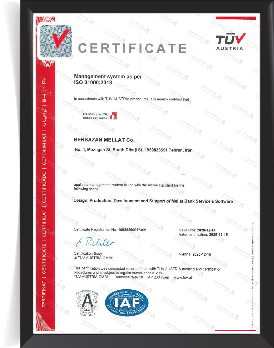 بهسازان‌ملت به عنوان نخستین شرکت ایرانی ارائه‌دهنده خدمات و زیرساخت فناوری اطلاعات بانکی (Core Banking)، موفق به اخذ گواهینامه انطباق با استاندارد مدیریت ریسک سازمانی (ISO 31000:2018) شد.